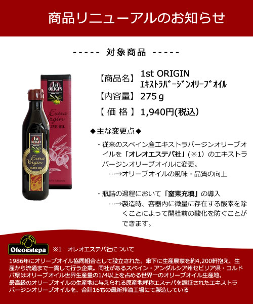 この度、大変ご好評頂いております弊社「1stORIGINエキストラバージンオリーブオイル275g」をリニューアル販売を行うこととなりました。