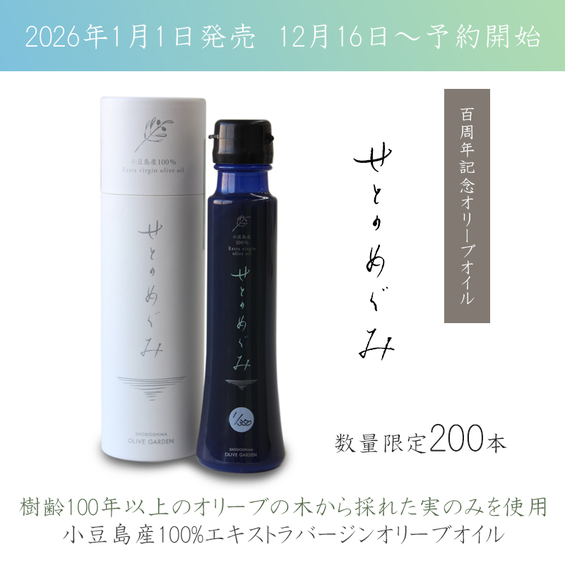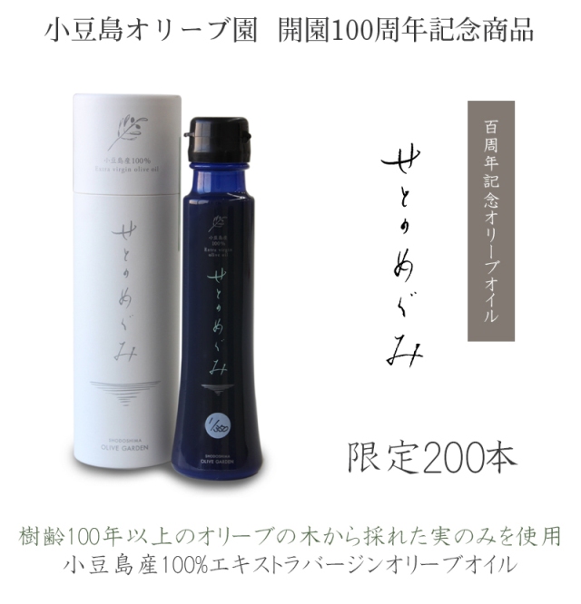 小豆島オリーブ園の開園100周年を記念して数量限定で生産された「せとのめぐみ」 樹齢100年のオリーブの巨木から採れた実のみを使用し、採油した小豆島産100%のエキストラバージンオリーブオイル。当園が贈る、メモリアルかつプレミアムな1本です。